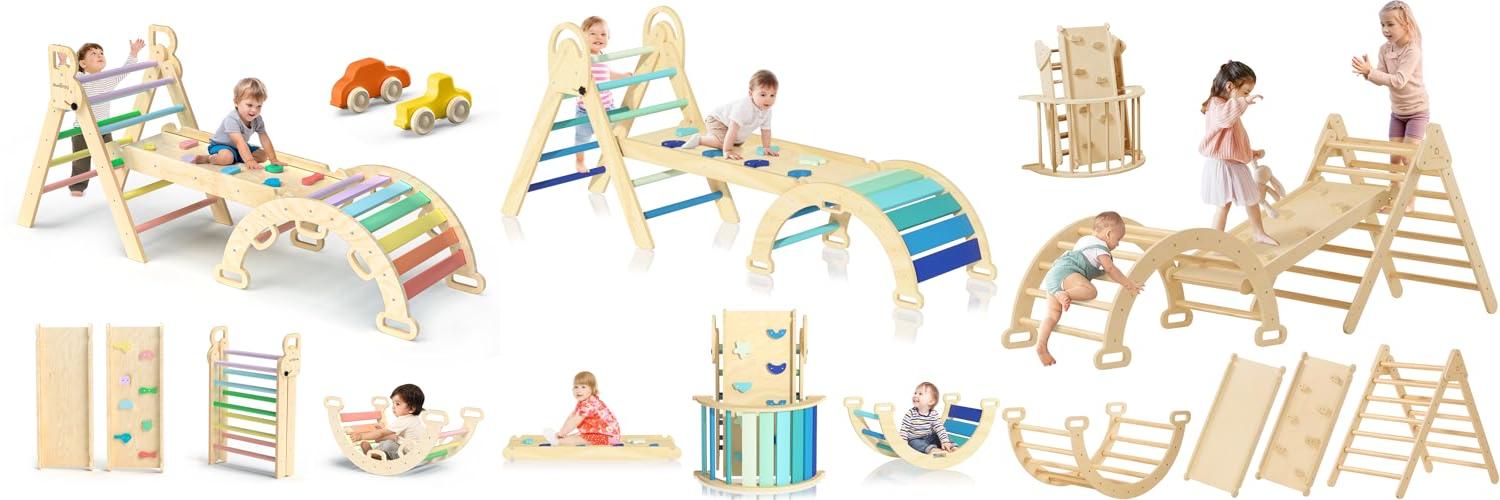 - 7 Versatile Play Modes: Kids get a Pikler triangle, a reversible board for climbing or sliding, and a climbing arch that also works as a rocker, offering endless fun.