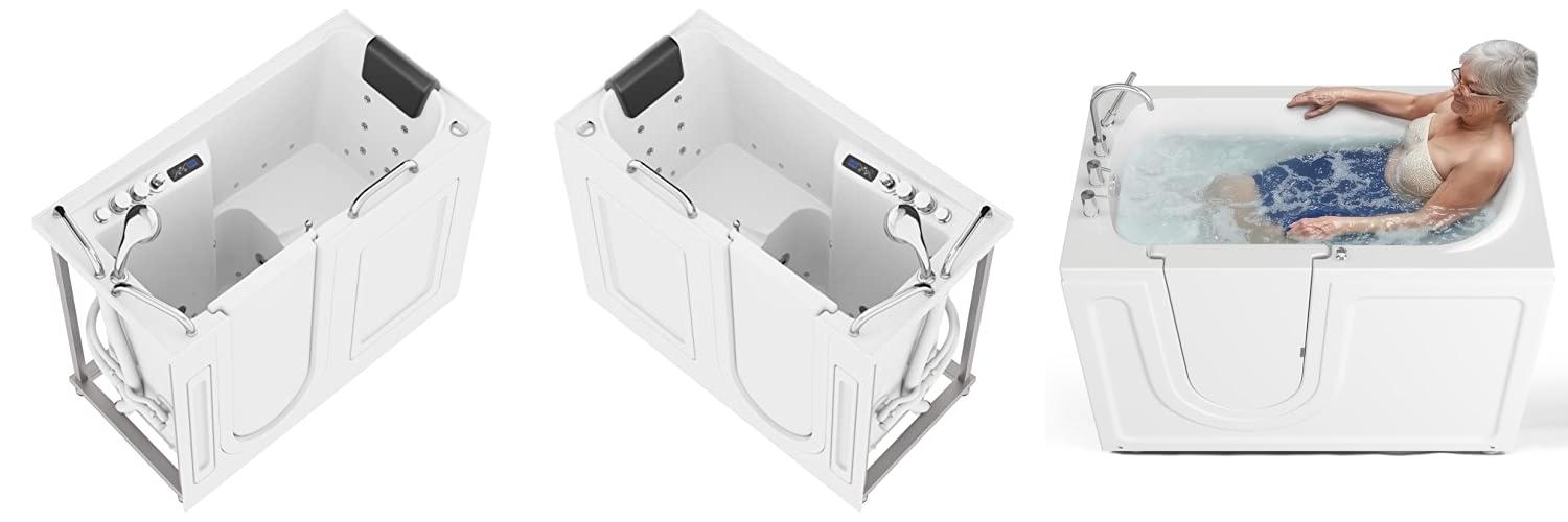 • The tub has a very safe and easy-to-use design. Its low entry makes getting in and out simple, especially for those using wheelchairs. The wide door opens easily.