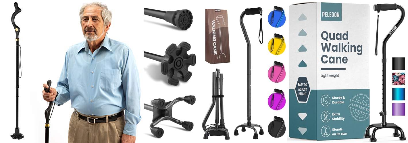 3. PELEGON Quad Cane (300 lb) – Adjustable Walking Cane with A Large 4 Pronged Base for Extra Balance & Stability